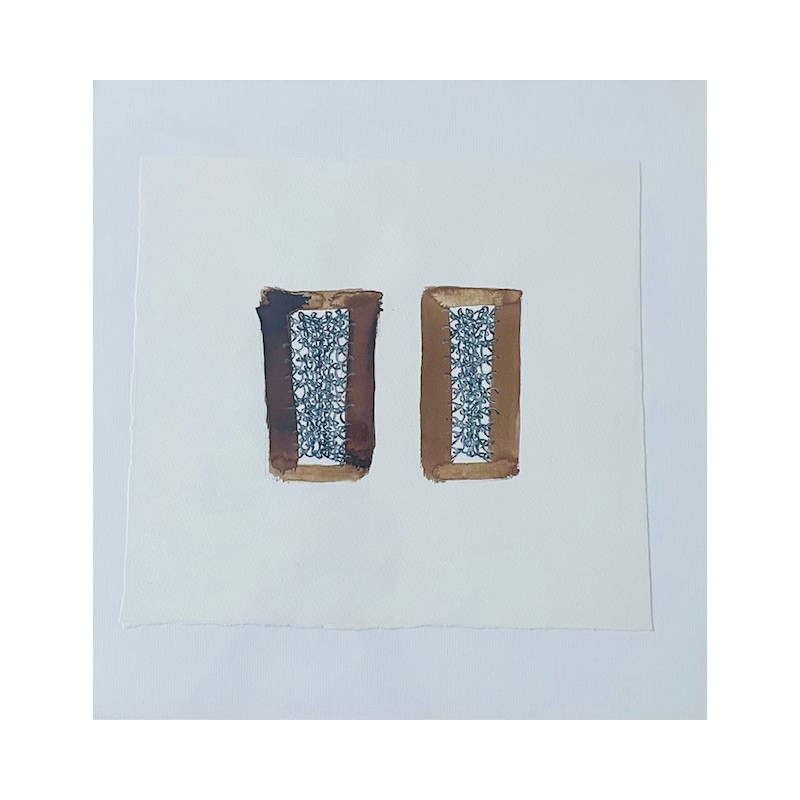 Dans cette œuvre, Isabelle Faccini mobilise ce répertoire de forme qui lui est propre : la maille. Cette dentelle semble voiler ces formes rectangulaires à la manière d’un rideau, ou bien être enfermée dans leurs cloisons, évoquant ainsi une relation ambivalente entre ces éléments.