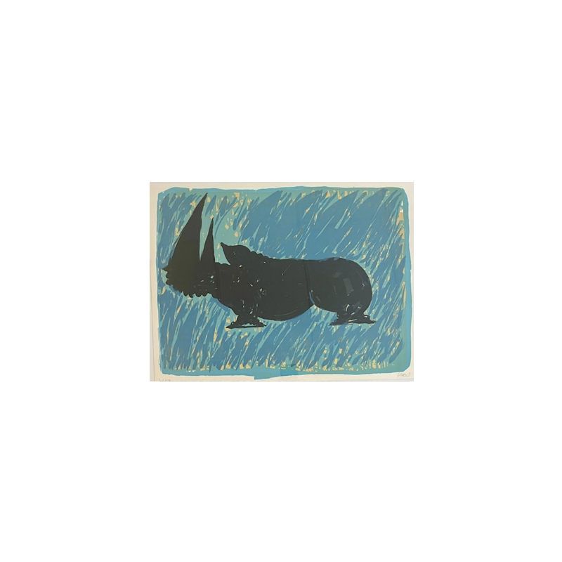 Ici, le rhinocéros se dévoile sur un fond bleu. Le trait est d’une grande finesse, accentuant la dualité force-vulnérabilité de l’animal.